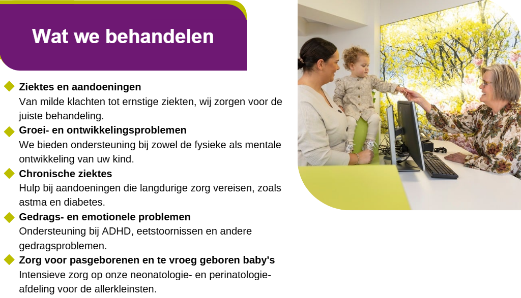 We werken nauw samen met u als ouder en met uw kind. Zo kunnen we de zorg geven die het beste past bij de specifieke behoeften van uw kind.