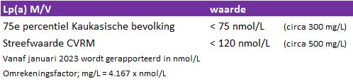 Een waarde van 290 nmol/L (circa 1200 mg/L) geeft een zeer hoog risico voor myocard infarct en aortaklepstenose.